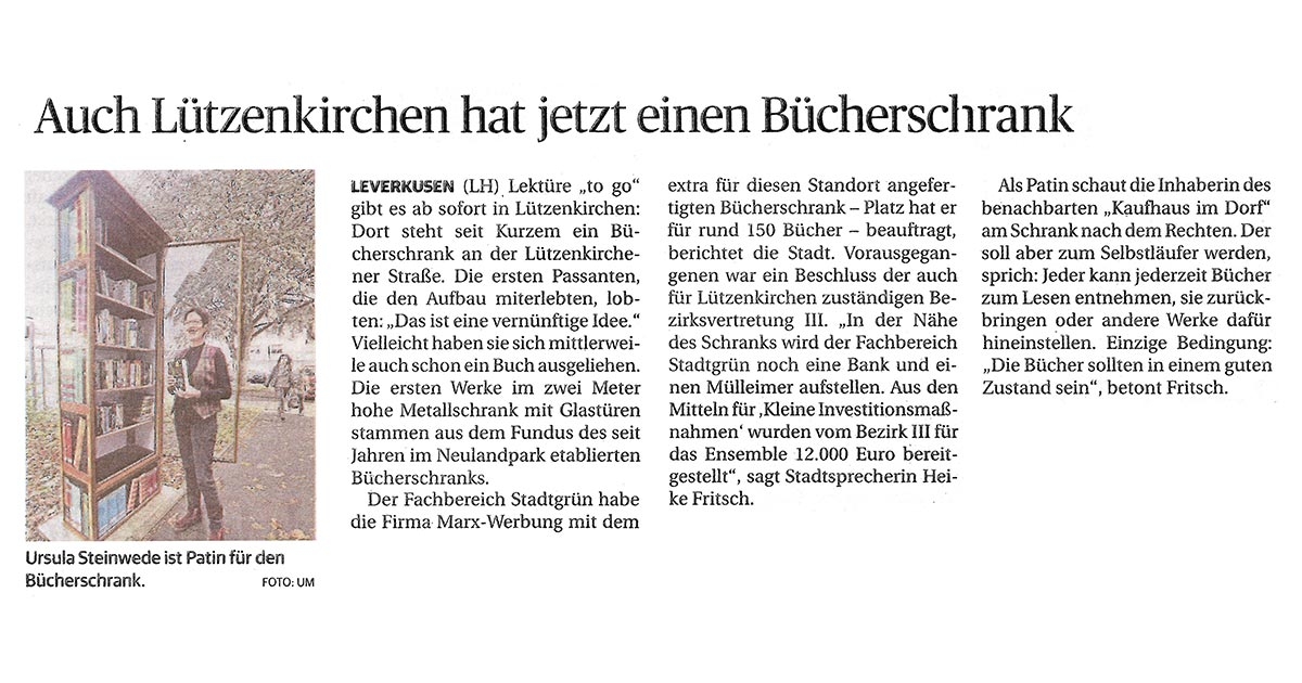 Heute in der Rheinischen Post erschienen: "Auch Lützenkirchen hat jetzt einen Bücherschrank (16.11.22)". So leer wie auf dem Foto ist der Bücherschrank allerdings schon lange nicht mehr. Die Lützenkirchener haben bereits für eine große Auswahl gesorgt. O-Ton Frau Kahdo: "Das Ding ist fast voll!"